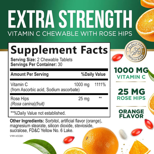 View full detailsVitamin C Supplement 1000mg - Extra Strength with Rose Hips Bioflavonoids - Sugar Free Vitamin C Chewable Pills, Nature's Vit C for Immune Support & Antioxidant Protection - 60 Chewable Tablets