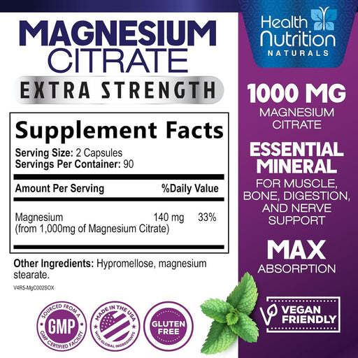Health Nutrition NaturalsMagnesium Citrate High Potency Magnesium Citrate Capsules 1000mg - Chelated for High Absorption - bottled in the USA - Best Bowel Supplement that S...