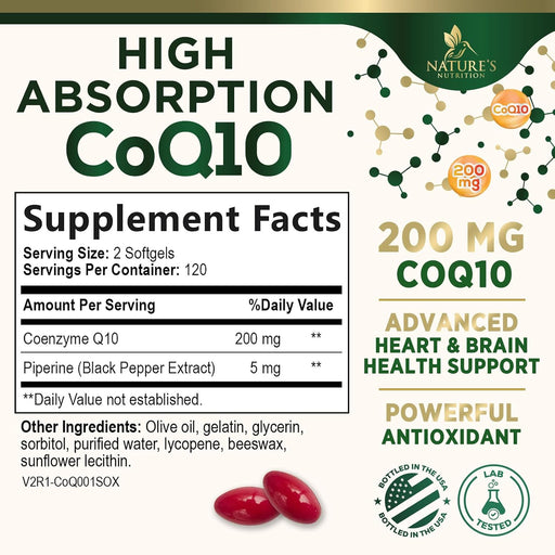 View full detailsCoQ10 200mg - Ultra High Absorption Co Q 10 Softgel Supplement With Black Pepper, Energy & Heart Health Support Antioxidant - Coenzyme Q10 (Ubiquinone) for Women & Men, Bottled in USA - 120 Softgels
