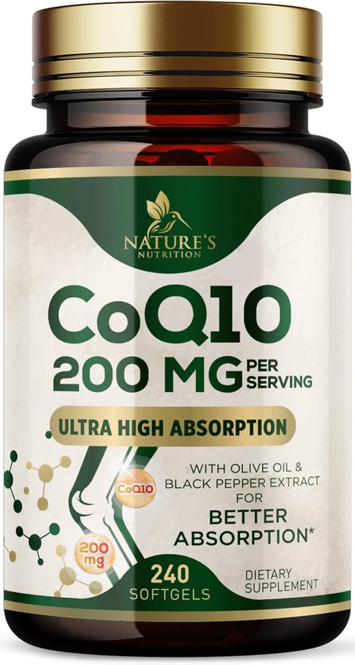 View full detailsCoQ10 200mg Softgels - Extra Strength Coenzyme Q10 Supplement With Black Pepper Extract for Enhanced Absorption, CoQ10 Antioxidant Supplements for Heart Health & Cellular Energy Support - 240 Softgels