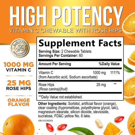 View full detailsVitamin C 1000mg Chewable Supplement - Extra Strength Immune Support Vitamin C Dietary Supplement with Rose HIPS, Nature's VitaminC Antioxidant Support, Natural, Vegan, Orange Flavor - 120 Tablets