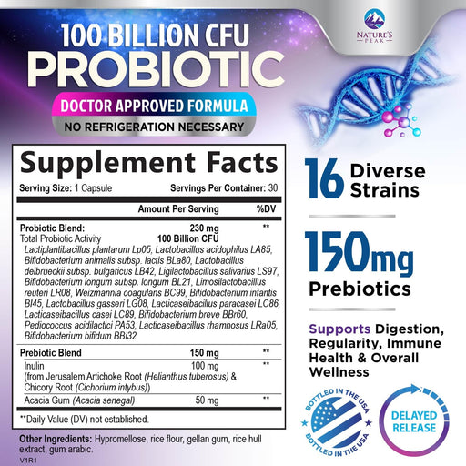 View full detailsProbiotics 100 Billion CFU Supplement - 16 Strains + Natural Prebiotics - Digestive Health, Gut & Immune Support for Women & Men - Supports Occasional Constipation, Gas & Bloating - 30 Capsules