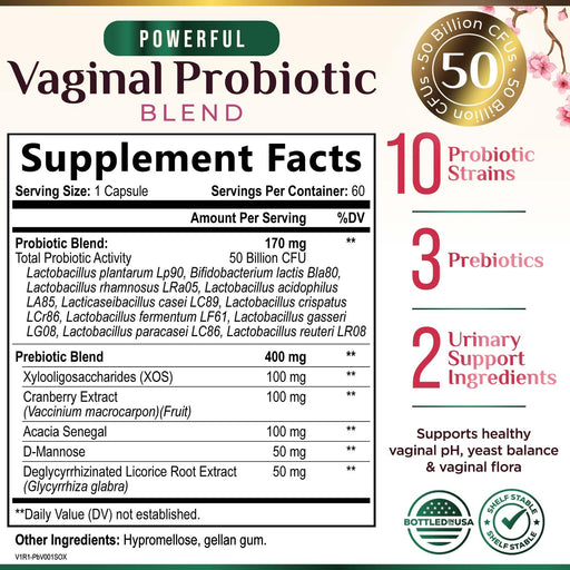 View full detailsVaginal Probiotics for Women - pH Balance, Digestive, UT & Feminine Health Support - 50 Billion CFU, 10 Probiotic Strains, Cranberry & Prebiotics - Vag Women Health Supplements - 60 Capsules