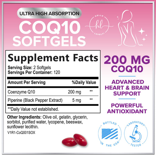 Hello Lovely!Support heart and energy with CoQ10 200mg Softgels, designed for 3X better absorption compared to standard coenzyme Q10 powders. Each serving deliv...