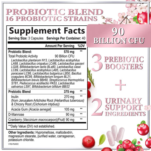 Probiotics for Women Supplement with Cranberry - 16 Premium Strains for PH Balance, Digestive Health, Vaginal & Immune Support, 90 Billion CFU, Women's Probiotic, UT, & Feminine Health - 120 Capsules
