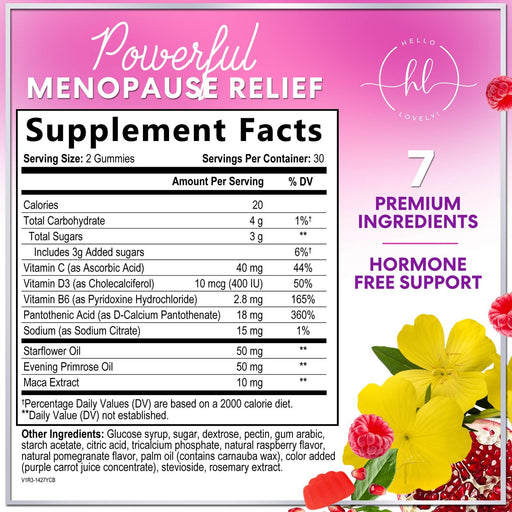 Hello Lovely!Experience natural menopause relief for women with Hello Lovely Menopause Supplements for Women. These raspberry-flavored gummies are designed to e...