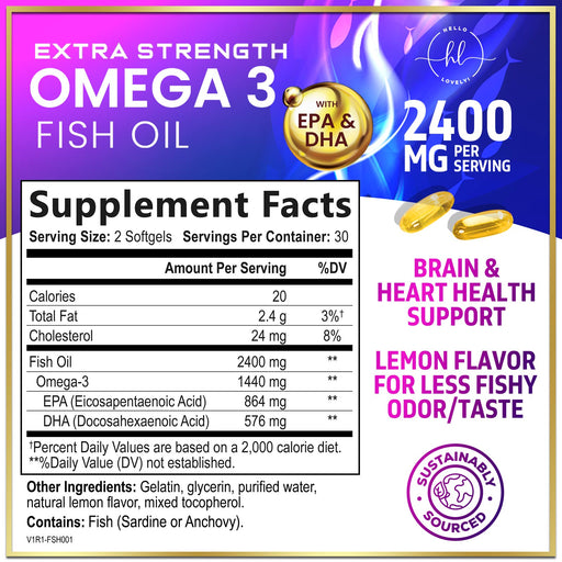 Hello Lovely!Support heart, brain, joints, and immune support with our Omega 3 Fish Oil Supplement. Each triple-strength serving delivers 2400mg of omega 3 fatt...