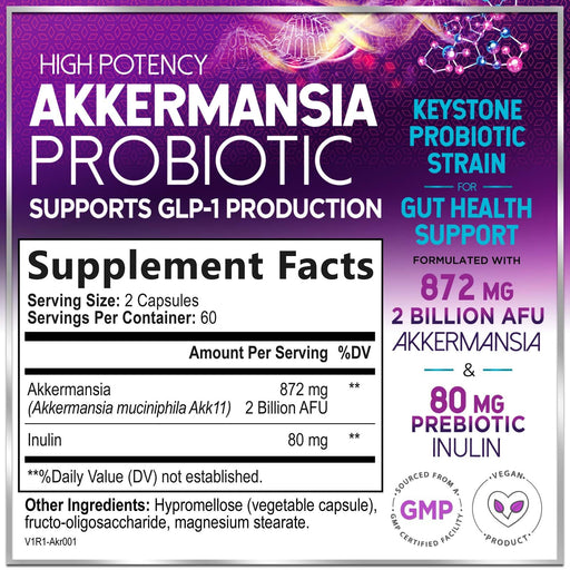 Akkermansia Probiotic with Prebiotic Fiber - Supports GLP-1 Production - 2 Billion AFU Strain for Digestive & Gut Health Support - Delayed Release, Third-Party Tested for Women & Men - 60 Capsules