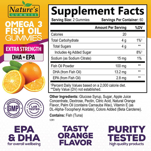 Nature's GummiesSupport your heart, brain, and joints with Nature's Gummies omega 3 fish oil gummies. Each serving contains omega 3 fatty acids including DHA and E...
