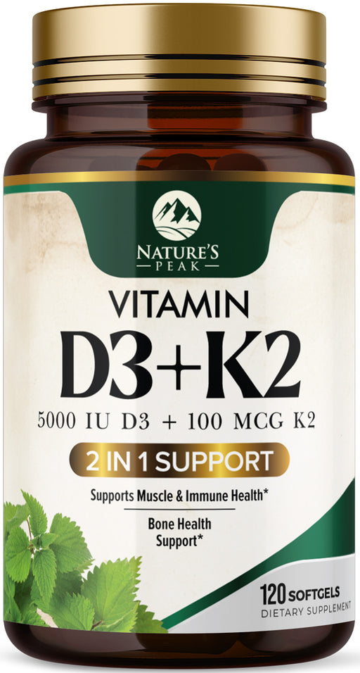 Nature's PeakK2 with High-Potency D3 Formula: This D3 K2 vitamin 5000 IU softgel combines vit D3 and MK-7, Vitamin K2, to support bone and immune health, and c...